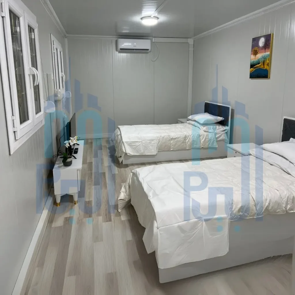 A two-story mobile hotel made from two prefab containers (3×7 meters), featuring a modern and stylish design perfect for tourism projects or luxury Chalets.